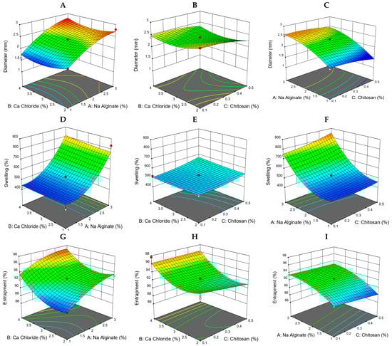 Response surface graphs for the impact of variables. (A–C) Response surface graphs representing the impact of various variables on the diameter of the formulations. (D–F) Response surface graphs representing the impact of various variables on swelling. (G–I) Response surface graphs representing the impact of various variables on the bead % entrapment efficiency.