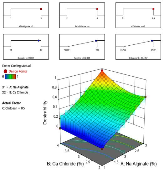 | Run | SALG (%) | CaCl2 (%) | CS (%) | Diameter (mm) | Swelling (%) | Entrapment (%) |