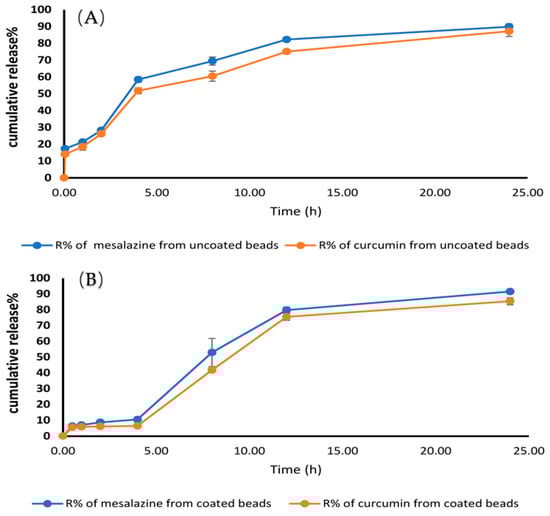 Figure 9 shows the in-vitro release characteristics of both uncoated and coated drug-loaded beads in a range of buffers with a decreasing pH. In the case of uncoated beads, 51.78 ± 1.82% of CUR and 58.46 ± 1.59% of MSZ was released in the initial 4 h. This situation is unacceptable for medications that need to be released locally in the colon. The release of drugs was delayed until the pH was above 7.0 by coating the beads with Eudragit® S-100 polymer. For this experiment, Eudragit® S-100 was used to cover the beads. Hydrogel beads encapsulating the drugs were shown to release their contents into simulated GIT fluids. Although the coated hydrogel beads showed promise, their initial drug release was disappointing. After 2 h, a minor fraction of the medicines could be detected in the pH 1.2 media. Only 6.01 ± 0.04% CUR and 8.64 ± 0.7% MSZ were released after 2 h, and 6.36 ± 0.11% CUR and 10.45 ± 1.52% MSZ were released after 4 h at pH 6.8. After 8 h, approximately 85.34 ± 2.3% CUR and 91.5 ± 1.2% MSZ were released at pH 7.4. Since the carboxyl groups in the Eudragit® S-100 polymerize from neutral to alkaline conditions, our results show that the medication was sheltered from gastric acid and enzymes. Ionization compromises the film’s structural integrity, allowing the drug to escape. The membrane layer on the hydrogel beads was dissolved at pH 7.4. The medication was released once the polymer matrix swelled and was eroded.