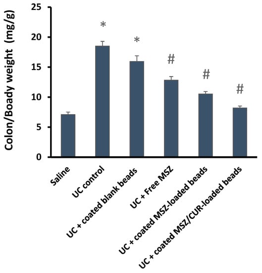 (1): Saline control: received saline solution (parallel to acetic acid application), (2) UC control, (3) UC + blank beads, (4) UC + free MSZ (equivalent to 20 mg/kg; administered orally), (5) UC + coated MSZ beads (equivalent to 20 mg/kg; administered orally), (6) UC + optimized formulation beads of CUR/MSZ coated with Eudragit® S-100 (curcumin 20 mg/kg).