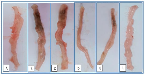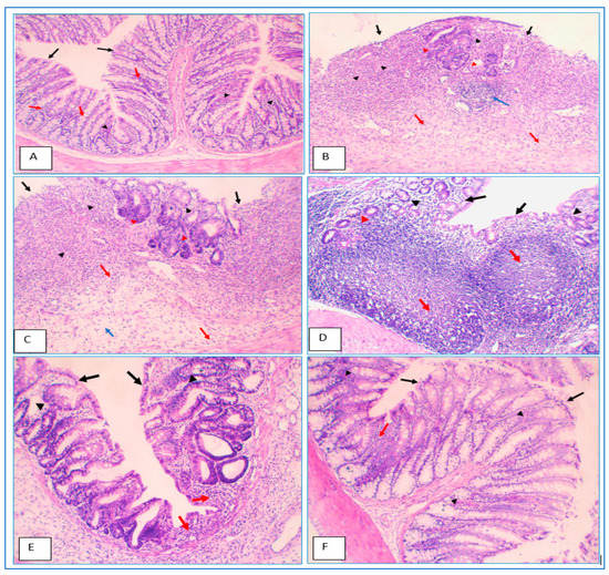 Colonic damage was measured via histological analysis. The colon specimens were collected from the distal colon and submerged in 10% phosphate buffered formalin before being fixed in paraffin. Hematoxylin and eosin were used to stain sections of 4 um thickness. A pathologist examined the slides for epithelial damage, architectural alterations, mononuclear cell infiltration, and ulceration []. Colon tissue sections were tested for pathological developments and scored for the following []: inflammation [none (0)/slight (1)/moderate (2)/and severe (3)], inflamed area/extent [mucosa (1)/mucosa and submucosa (2)/and transmural (3)], crypt damage [none (0)/basal 1/3 damaged (1)/basal 2/3 damaged (2)/only the surface epithelium is intact (3)/and entire crypt and epithelium are lost (4)], and percent involvement [1–25% (1)/26–50% (2)/51–75% (3)/and 76–100% (4)].