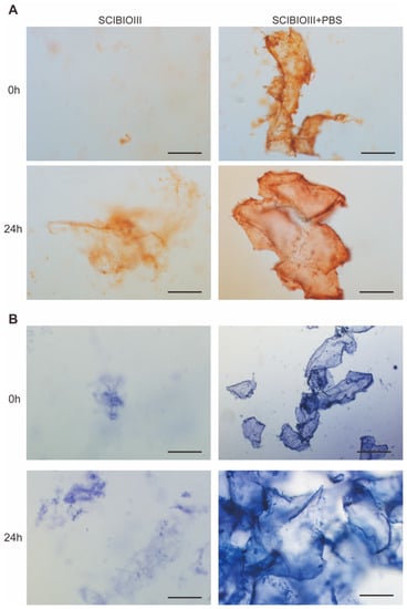 Congo red/aniline blue staining analysis. (A) Congo red staining results of SCIBIOIII at 0 h and 24 h; (B) aniline blue staining results of SCIBIOIII at 0 h and 24 h. Scale bar: 200 µm.