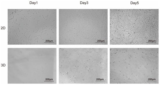 Microscopic morphology of NIH3t3 at days 1, 3, and 5 in 2D and 3D cultures. The 2D group did not have peptide added, and the 3D group had 50 µL of SCIBIOIII peptide solution added in each well.