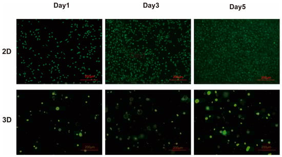Cytotoxicity analysis of NIH3t3 in SCIBIOIII hydrogels. Calcein-AM staining analysis of NIH3t3 cells cultured in 2D and 3D on days 1, 3, and 5. Live cells are green.