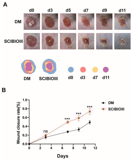 SCIBIOIII hydrogel accelerates wound closure in diabetic mice. (A) Photographs of skin wounds (representative images) and signs of wound closure within 11 days were recorded at the specified times (n = 5). (B) Wound recovery rates from day 0 to 11 were calculated based on images of the wounds (n = 10 wounds). ns p > 0.05, *** p < 0.001.