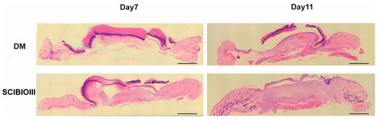 SCIBIOIII hydrogel advanced the formation of granulation tissue in diabetic mice with skin wounds. Representative pictures on days 7 and 11 (n = 5). Scale bar: 1.5 mm.