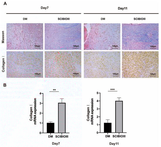 Next, collagen deposition changes in the skin samples treated with and without the SCIBIOIII hydrogel were examined. MASSON staining demonstrated a significant increase in collagen deposition in diabetic skin wounds on days 7 and 11 after SCIBIOIII hydrogel injection compared to the DM group without SCIBIOIII treatment (Figure 7A). Moreover, the IHC staining results also showed a significant increase in collagen I expression on days 7 and 11, following surgery, in the wounds of the peptide group (Figure 7A). Furthermore, the real−time fluorescence quantitative PCR results revealed that the ECM protein collagen I mRNA expression volumes in the wounds of the SCIBIOIII group were significantly higher than in the DM model group (Figure 7B). These results demonstrate that the formation of collagen in diabetic skin tissue is enhanced when using SCIBIOIII hydrogel.
