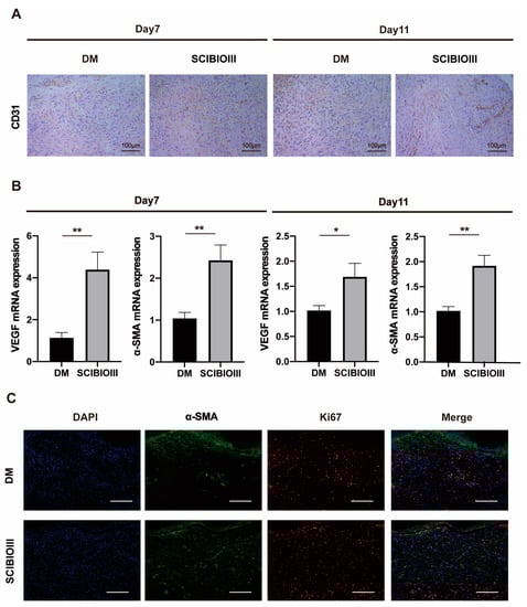 (A) IHC results of CD31 from days 7 and 11 from the skin tissue of diabetic mice treated or untreated with SCIBIOIII (representative images). (B) qPCR results, the mRNA levels of VEGF and α−SMA on days 7 and 11 from the skin tissue of diabetic mice treated or untreated with SCIBIOIII by qPCR (n = 5). (C) Immunofluorescence staining results of skin tissue sections on day 11. Scale bar: 100 µm. * p < 0.05, ** p < 0.01.