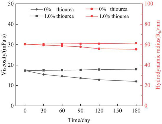 In gas flooding reservoirs, it is generally required that the polymer gel maintain long-term stability and that the validity period for polymer gel treatment needed to reach up to 180 days. Meanwhile, high-pressure flue gas will be continuously injected into the reservoir during flue gas flooding. However, the flue gas contains 3% O2, and under high pressure flue gas, O2 will be continuously dissolved in large quantities in the gels. Our previous work shows that O2 leads to polymer degradation and impairment of the polymer stability [11,12]. Hence, a sufficient amount of thiourea needs to be added to the gelant to meet the long-term stability of the polymer. In this study, a 0.5 wt% HPAM solution is prepared. 1.0 wt% thiourea is optimized and added to the polymer solution. The effect of thiourea on polymer stability in a flue gas environment is studied. In particular, the pressure of flue gas was set at 6 MPa owing to that it is a relatively high injection pressure for flue gas flooding. It also should be emphasized that all the experiments are conducted at 42 °C (reservoir temperature). Figure 1 displays the result of viscosity and Rh of the polymer solution as a function of aging time. It is observed that the viscosity of polymers without the addition of thiourea decreases obviously within 180 days, which is the same tendency for hydrodynamic radius (Rh). The decrease percentage of viscosity is calculated to be up to 30% after aging for 180 days, and 28% in the Rh. By contrast, the polymer with the addition of 1 wt% thiourea shows slightly change in viscosity and Rh after 180 days, indicating that thiourea effectively inhibits the degradation of the polymer chains, which results in a desirable long-term stability of polymer.