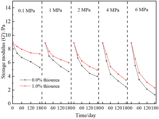 According to the above result, the presence of thiourea may contribute to the long-term stability of cross-linked gels. The strength of polymer gel at elevated flue gas pressures is investigated. The gel formula, consisting of 0.5 wt% polymer and 0.0625 wt% chromium acetate, is optimized in our previous work and employed in this study [11,36]. 1.0 wt% thiourea is added to the gels. As shown in Figure 2, with the addition of thiourea, the strength and stability of the gels are all improved at elevated flue gas pressures. In detail, the storage modulus (G′) of the gel in the absence of thiourea decreases from 5.29 Pa to 1.31 Pa when the flue gas pressure rises from 0.1 MPa to 6 MPa after aging for 180 days while increasing from 7.92 Pa to 2.31 Pa in the presence of thiourea. This is because the thiourea inhibits the degradation of polymers in the gels, which in turn improves the long-term stability of bulk gels.