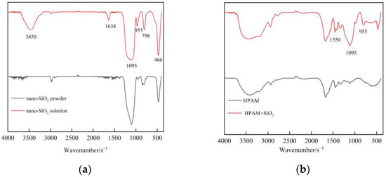 Nano-SiO2 is an effective means to improve polymer stability and gel strength. The interaction between nanoparticles and polymers is studied by FTIR spectra analyses. Figure 3a contrasts the FTIR spectra of nano-SiO2 powder and nano-SiO2 solution. The strong and broad absorption band at 1095 cm−1 and the peaks at 798 cm−1 as well as 466 cm−1 in pure nano-SiO2 powder are attributed to the Si–O–Si antisymmetric stretching vibration and the Si–O bond symmetric stretching vibration. Afterwards, the nano-SiO2 is dispersed in an aqueous solution to form silica sol. The structural water –OH antisymmetric stretching vibration and the water H–O–H bending vibration appear at 3450 cm−1 and 1638 cm−1. The bending vibration peak of Si–OH appears at 958 cm−1. The absorption peaks of new groups indicate that the Si–O–Si on the surface of SiO2 decomposes into Si–OH in solution, which makes the nano-SiO2 carry a large number of –OH. After the addition of SiO2 nanoparticles to the polymer (Figure 3b), Si–NH2 bending vibration peaks appear between the nanoparticles and the HPAM at 1550 cm−1, respectively, which is consistent with the result from Giraldo et al. [22]. The –OH group in the 800 cm−1 region may react with amide (–NH2), aldehyde, and/or carboxylic acid groups (–COOH) to form hydrogen bridges. The interaction between functional groups was confirmed by FTIR analyses, where the –OH on the surface of the nano-SiO2 formed bridges and/or hydrogen bonds with the free groups O (amide group, carboxylic acid) and N (1550–1530 cm−1) of the polymer [37].