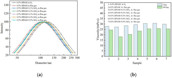 To further illustrate the effect of nano-SiO2 on the properties of polymer molecules, research was performed about Rh and viscosity changes of polymer solutions saturated with flue gas. Figure 4a shows the results of Rh changes in a 0.5 wt% polymer solution after aging for 3 days at 42 °C. The mass fraction of the nanoparticles ranged from 0 wt% to 0.5 wt%. It can be seen that the flue gas curves the polymer molecule chains and decreases the Rh, which is founded in our previous work [11,12]. After the addition of nano-SiO2, the interaction between nano-SiO2 and polymer leads to an increase in Rh (Figure 4a), and improves the viscosity of the polymer solution (Figure 4b). It is worth noting that the viscosity increases distinctly with the addition of 0.0–0.3 wt% nano-SiO2. The polymer molecules are induced to form a uniform structure with the addition of 0.3 wt% nano-SiO2. Increasing the quantity of nano-SiO2 has a small influence on the steady structure of polymers, which results in a slight rising tendency when the concentration increases to 0.4 wt% or more. After aging for 180 days under the flue gas environment, the polymer solution still maintains excellent stability. The result demonstrates that the nano-SiO2 inhibits the entanglement of the polymer molecules and makes the polymer molecules more stretched, facilitating the dispersion of polymer molecules and the stability of polymer configuration.