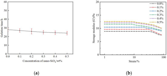 Effect of nano-SiO2 on gelation performance of polymer gel: (a) Gelation time; (b) Gel strength.