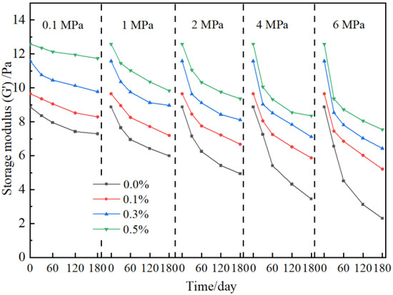 To study the influence of nanoparticles on the long-term stability of gels, the strength of gel under high-pressure flue gas is further investigated, as shown in Figure 6. The strength of gel without the addition of nano-SiO2 decreases to different degrees under different flue gas pressures and performs seriously with the increase in pressure due to the comprehensive effect of CO2 and O2 composed in flue gas [11,12]. In contrast, the strength of the gel in the presence of nano-SiO2 is improved under different flue gas pressures. With the increase in nano-SiO2 concentration, the gel strength increases obviously. Taking 2 MPa of flue gas as an example, the storage modulus of gels without nano-SiO2 in a flue gas environment for 180 days is 4.94 Pa, while with the addition of 0.1%, 0.3%, and 0.5% nano-SiO2, the increase percentage of gel strength is calculated to be 25.9%, 39.1%, and 47.2%, respectively. In our previous work, it was also found that the nano-SiO2 reinforced gel showed satisfying long-term stability and maintained an intact network structure [38].