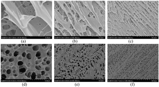 Cryo-SEM image of polymer gel: without nano-SiO2: (a) ×10.0 k; (b) ×3.0 k; (c) ×1.0 k; with 0.3 wt% nano-SiO2: (d) ×10.0 k; (e) ×3.0 k; (f) ×1.0 k.