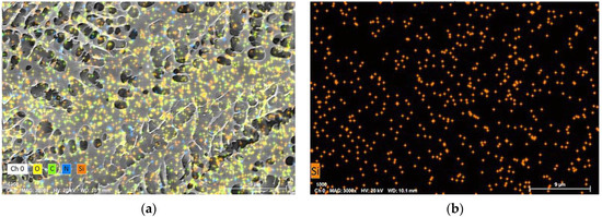 To further study the stability mechanism of reinforced gel, a Cryo-SEM is conducted to investigate the microstructures of gels. The gel sample group is prepared with 0.5 wt% polymer, 0.0625% chromium acetate, 1.0 wt% thiourea, and 0.3 wt% nano-SiO2. Notably, the optimized concentration of nano-SiO2 is 0.3 wt% as a result of acceptable gel strength and economic consideration. The blank group is in absence of nano-SiO2. The gels are aged for 180 days in 2 MPa flue gas. As compared in Figure 7, it is found that the blank group has a heterogeneous lamellae structure with many holes due to the fact that the flue gas penetrates the gel. The cracks observed in the gel lead to a decrease in G′, as shown in Figure 7a–c. Whereas, for the gel sample group, the gel exhibits a honeycomb structure, presenting a firm and uniform network structure (Figure 7d–f). Noteworthily, the pore size of the gel with the addition of nano-SiO2 is 1–2 um, whereas it varies from 2 um to 10 um in the blank sample. Based on the result from Section 2.2.3, it is hypothesized that the decrease in pore size leads to a reduction in surface area and an increase in gel density, which positively improves gel strength. Furthermore, the Croy-SEM-EDS images indicate that the gel network structure is uniformly interspersed with the nano-SiO2 particles (orange dots in Figure 8). In conclusion, hydrogen bonding is formed between nano-SiO2 and polymer molecules, which makes them more stretched in the flue gas environment and promotes the homogeneity of the polymer. Furthermore, the adsorption of nano-SiO2 onto polymer chains encrypts the network structure of bulk gel. The enhancement of microstructure leads to an increase in the viscosity of the gelant and the strength of the cross-linked gel, which greatly improves the long-term stability of the gel.