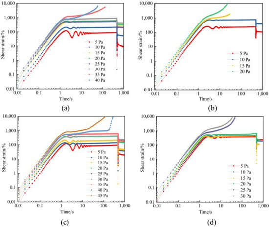 Creep strain of polymer gels at different shear stresses: (a) Gel without the additives after 3 days; (b) Gel without the additives after 180 days; (c) Gel with the addition of additives after 3 days; (d) Gel with the addition of additives after 180 days.