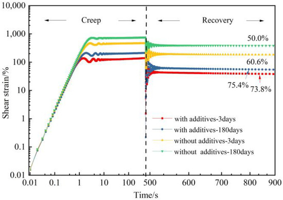 Creep-recovery experiments can clearly distinguish the elastic and viscous responses of gels. The creep recovery of gels at 10 Pa stress was investigated. It can be seen from Figure 10 that after unloading by external forces, part of the deformation is recovered due to the elasticity of the gels, and the other part of the deformation is lost due to flow. After aging for 180 days under 2 MPa flue gas pressure, the creep recovery rate of gels decreases from 60.6% to 50.0%. With the addition of additives to the gel system, the creep compliance was reduced, and the creep recovery rate of the gel decreased from 75.4% to 73.8%. The results indicate that the introduction of additives increases the elasticity of polymer gels, which may be caused by the interaction between nano-SiO2 and polymers and the inhibited degradation resulting from thiourea.