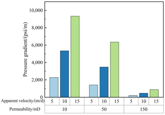 Well Hong 48 in Xingjiang oilfield is a low-permeability (10–500 mD) flue gas flooding reservoir, which requires good injection performance of gelant. The injection performance of gelant in a low-permeability core is investigated. Sandstone cores, with a permeability of 10 mD, 50 mD, and 150 mD, are prepared. The gelant, consisting of 0.5 wt% HPAM, 0.625 wt% chromium acetate, 0.3 wt% nano-SiO2, and 1% thiourea, was employed for the three flooding experiments. Figure 11 depicts the relationship between the injection pressure gradient and the permeability as well as the injection velocity of gelant. Under a certain injection speed, the injection pressure gradient decreases with the increase in permeability. The injection pressure gradient was acceptable in 50 mD and 150 mD cores. Although the value was relatively high in the 10 mD core, no blocking phenomenon was found during the gelant flooding experiment. The result shows that the gelant composed of a 2 million molecular weight polymer has good injection performance.