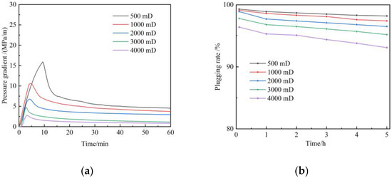 Plugging performance of polymer gel during flue gas flooding: (a) Breakthrough pressure gradient; (b) Plugging rate.