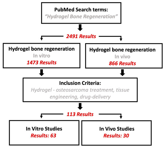 PubMed was queried for articles with the search term “Hydrogel Bone Regeneration,” which yielded 2491 results. Of the 2491 hits, 1473 articles were studies conducted in vitro, and 866 articles were conducted in vivo. The search was further restricted to the terms “Hydrogel-osteosarcoma treatment,” “tissue engineering,” and “drug-delivery,” resulting in 113 results, of which 63 were in vitro studies and 30 in vivo studies (Figure 1). Herein, we summarize the results of these studies.
