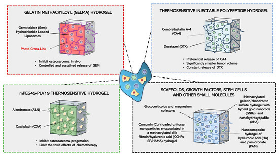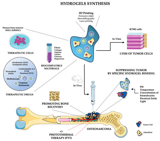 While patient tolerance to chemotherapy drugs and tissue loss post-surgery are concerns, this can potentially be addressed simultaneously with drug-loaded hydrogels directly targeting the affected osteosarcoma site [20]. In tissue engineering, hydrogels and polymeric implants or scaffolds have been used for their ability to simultaneously release preloaded drugs and induce native tissue regeneration [21,22]. In preclinical osteosarcoma models, hydrogels were studied for their capacity to reduce tumor size with enhanced drug release. In this review, we describe the use of drug-loaded hydrogels for osteosarcoma therapy and subsequent bone regeneration. Furthermore, in-depth details about the future applications of these implantable scaffolds to effectively treat osteosarcoma in animal models are also discussed.
