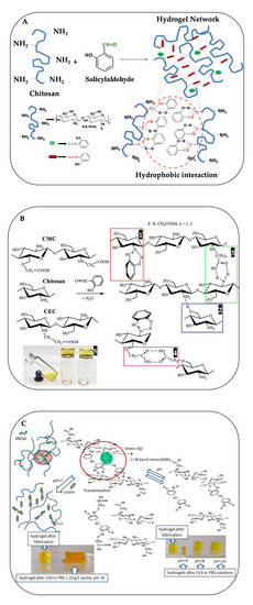 Chitosan-based physical hydrogels are produced by ion-complex formations with negatively charged molecules such as dicarboxylic acids [58], citric acid (tricarboxylic acid) [59], sulfates, phosphates [60], gallic acid [61], alginate [62,63,64,65], pectin [66,67], sulfoethyl cellulose [68], and hyaluronic acid [69]. Through the physical interaction between anions of these molecules and cations of chitosan hydrogels can be formed. While retaining the properties, such as nontoxicity, pH-responsive, hydrophilicity, and biodegradability, of the individual original polymers, e.g., chitosan and hyaluronic acid, the chemical, physical, and other functional properties of the hydrogel are different [70,71]. Moreover, polyelectrolyte complexes, such as chondroitin sulfate [72], carrageenan [73,74,75], and carboxymethyl cellulose [76,77], or other water-soluble nonionic polymers, such as polyvinyl alcohol (PVA) [78,79,80], can also form polymeric bonds with chitosan, resulting in the hydrogel. By amide bond crosslinking between the carboxylated PVA and chitosan, as well as coordination crosslinking between chitosan and Fe3+, mechanical, adhesive, and self-healing properties of the hydrogel can be enhanced [81].