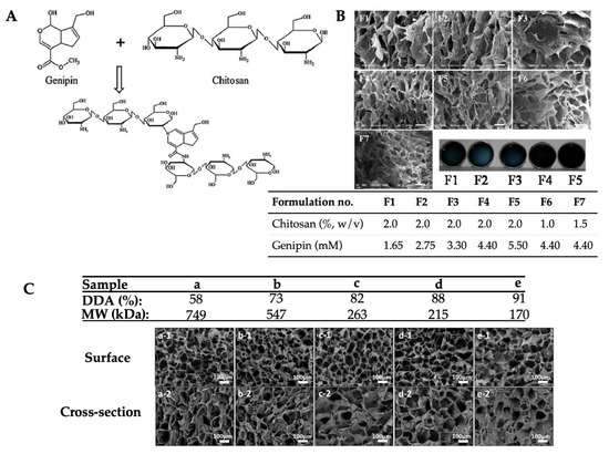 Also, porous structure of the soft hydrogels can be tailored by varying genipin and chitosan concentrations [119] (Figure 3A,B), as well as deacetylation degree (DDA) and molecular weight (MW) of the chitosan [120] (Figure 3C). More compact microstructures and improved mechanical properties of the chitosan hydrogel are reported by the use of succinic acid and urea, in addition to chemical crosslinking, in the presence of genipin [121]. Therefore, several studies have reported the utilization of the genipin-crosslinked chitosan for anti-bacterial material [122], as a carrier of drugs including 5-fluorouracil [123], cisplatin [124], and cytarabine [125], as well as for the treatment of diabetes [126] and diabetic wounds [127]. However, the drawback of using genipin as a crosslinker is relatively long gelation time [128].