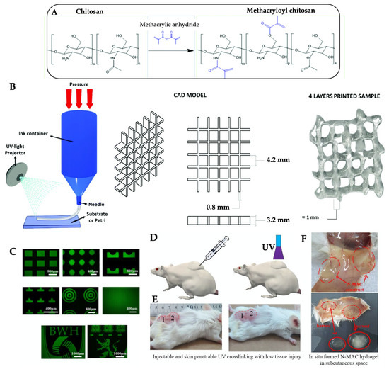 Photo-crosslinking is one of the promising chemical crosslinking methods in the presence of a photo-initiator. Due to rapid cure, low curing temperature, in-line production, and ability to tailor the hydrogel, crosslinking chitosan hydrogel by photopolymerization is widely applied to form 3D hydrogels. The photo-crosslinked hydrogels also have injectability features, because of gel formation, after they are photo-polymerized. Photo-responsive chitosan hydrogel can be prepared through functionalization with light-sensitive components/precursors, such as 2-amino ethyl methacrylate [129], methacryloylglycine [130], glycidyl methacrylate [131,132], and methacrylic anhydride [133,134,135]. Then, the functionalized chitosan solution is mixed with a photo-initiator such as 2-hydroxy-2-methylpropiophenone [134] and lithium phenyl-2,4,6-trimethylbenzoylphosphinate [135]. The methacrylic anhydride, which interacts with the amidogen of chitosan through acylation/methacrylation reaction (Figure 4A), is often used in the recent literature due to its solubility and a certain degree of cytotoxicity. However, disadvantage of the functionalization with photo-curable groups, i.e., methacrylate or acrylate, are time-consuming. The reaction can be sped up by microwave heating (800 W) using a chitosan and methacrylic anhydride molar ratio of 1:1, reaction temperature of 80 °C, launch time of 60 s, and reaction time of 10 min [135]. The hydrogel possesses 3D printability, with a high matching degree to the mold (Figure 4B–D) and injectability with transdermal curing (Figure 4E,F) [135,136].