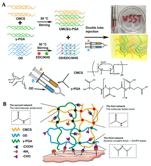 Schematic illustration of synthesis (A) and triple-network structure of carboxymethyl chitosans (CMCs), crosslinked by oxidized dextran (OD) and poly-γ-glutamic acid (γ-PGA) (B) (red dots: intramolecular amide bonds; black dots: intermolecular amide bonds; green dots: Schiff base bonds); [reprinted with permission from ref. [155,156] Copyright © 2022, Elsevier].