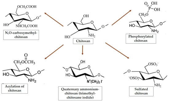 - Phosphorylated chitosan. There are numerous methods for producing phosphorylated chitosan derivatives. Chitosan can be phosphorylated with phosphorous pentoxide or orthophosphoric acid via thermal treatment, depending on the applications. Furthermore, phosphorylated chitosan can be efficiently produced via the reaction of phosphorus pentoxide and methanesulfonic acid [,,]. Increased hydroxyl phosphorylation on chitosan at carbon 3 and carbon 6 improves the bacterial cell wall. Chitosan can be mono- or disubstituted, depending on the chemical reaction (Figure 2) [].