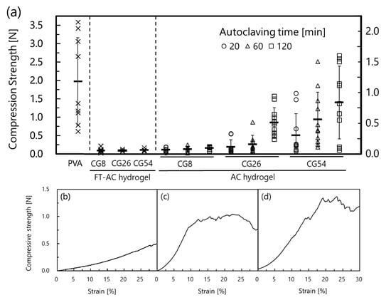 (a) The compressive strength at 10% strain of AC hydrogels prepared at different autoclaving times (20–120 min), FT-AC hydrogels, and poly(vinyl alcohol) (PVA) hydrogels (used as a major component of commercial wound dressing) (n = 6–12). The scale on the left vertical axis is for PVA hydrogel and the scale on the right vertical axis is for AC hydrogel and FT-AC hydrogel. Typical compressive strength vs strain curve of (b) CG8, (c) CG26, (d) CG54 AC hydrogels.