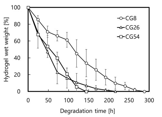 Chitosan is degraded by lysozyme in the body. Therefore, it is very important to investigate the degradability of AC hydrogels when using them as wound dressings. In this study, we investigated the effect of gluconic acid content on the degradability of AC hydrogels. CG54 AC hydrogels were completely degraded within 150 h (Figure 4). CG26 AC hydrogels were completely degraded over a longer period of more than 200 h. CG8 AC hydrogels took the longest time (290 h) to degrade completely. These results attributed to the difference in the total number of units of CG including the D-glucosamine unit, N-acetylglucosamine unit, and gluconic acid modified-D-glucosamine unit. Because of this, lysozyme hydrolyzes the β-1,4 glycosidic bonds between these units, which means that the larger the total number of units of CG, the longer the hydrogel takes time to be completely degraded. Considering the molecular weights of the D-glucosamine unit, the N-acetylglucosamine unit, and the gluconate-modified D-glucosamine unit are 161, 203, and 339, respectively, and the degree of deacetylation and the percentage of gluconic acid content, the average molecular weight of CG8, CG26, and CG54 are 180.6, 207.3, and 248.2, respectively. That is, the ratio of the total number of units present in the 2% (w/v) CG8, CG26, and CG54 AC hydrogels is 1.37:1.20:1.00, respectively. Based on this, the time it takes to degrade the CG AC hydrogels was longer with a decrease in gluconic acid content.