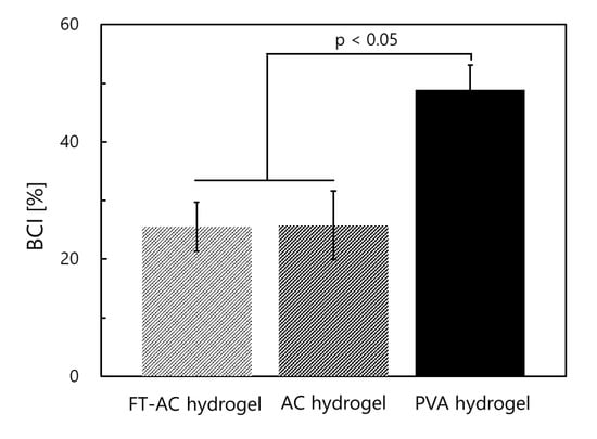 It is important to investigate the hemostatic properties of AC hydrogels when using them as wound dressings. Chitosan, a positively charged polymer, electrostatically attracts negatively charged red blood cells and platelets, resulting in the formation of blood clots (hemostasis). Hemostatic properties of AC hydrogels were examined by means of a blood-clotting test. AC hydrogels (CG26) had a lower coagulation index than poly (vinyl alcohol) (PVA) hydrogels prepared by freeze-thawing of PVA aqueous solution (Figure 5). PVA was used because the polymer has been used as a commercial dressing material. These results show that AC hydrogels coagulate a large number of blood cells and have excellent hemostatic properties. Furthermore, there was no difference in the hemostatic properties between AC hydrogels and FT-AC hydrogel, showing that AC hydrogels retained favorable biological properties of FT-AC hydrogels.
