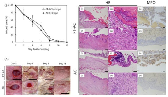 (a) Healing rate of wounds treated with CG26 AC and FT-AC hydrogels (day 0 and 2 n = 11, day 4 n = 10, day 6 n = 9, day 8 n = 8, day 10 n = 7, day 12 n = 3). (b) The macroscopic observation of wounds treated with FT-AC and AC hydrogel (Scale bars are 1 cm). (c–n) Hematoxylin- and eosin- (HE) (c,d,f,g,i,j,l,m) and immunohistochemically stained sections of myeloperoxidase (MPO) (e,h,k,n) of wound tissues treated with AC and FT-AC hydrogels of day 2 (c,e,i,k) and day 12 (f,h,l,n). (d,g,j,m) Magnified image of (c,f,i,l). Scale bars are 200 µm (c,f,i,l), 50 µm (d,g,j,m), and 100 µm (e,h,k,n), respectively.