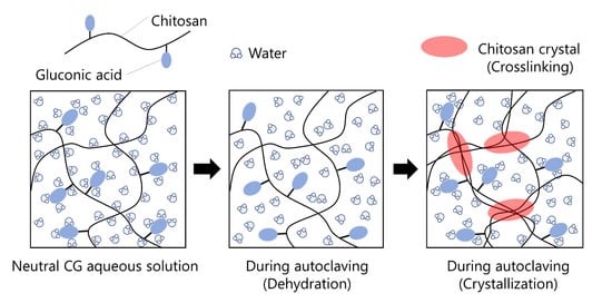Mechanism of hydrogelation of chitosan-gluconic acid conjugate (CG) aqueous solution by autoclaving. When the neutral CG aqueous solution is heated by autoclaving, perturbation and dehydration occur, which makes crystallization superior to hydration, accelerating crystallization (crosslinking).