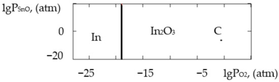The construction of a partial pressure diagram (PPD) was based on an analysis of the conditions of an equilibrium in a heterogeneous chemical reaction in the presence of gas-like substances. The PPD showed areas of resistance or a condensed phase depending on the composition of the gas phase, as well as the isothermal cross-sections of the PPD of three-component systems, including a gas phase consisting of two gases. As a result of the X-ray phase analysis, the condensed phases of such a system were either in a solid or liquid state and did not form solid solutions. Phase equilibriums in a Sn–Si–In–O system can be represented in a geometrical way using an N-dimension space, with N being greater than three, but in order to simplify the calculations and provide it in a more graphic way, the system was divided into three subsystems. It is known [49] that the vapour pressure of Si, SiO and SiO2 above the solid phase of SiO2 is considerably lower than the pressure of SnO vapours above solid SnO2. This way, in the gas phase, except for oxygen, gaseous SnO was prevalent over composite materials consisting of SnO2 and SiO2, that is why the PPD for the Sn–Si–O subsystem was built within the lgPO2–lgPSnO coordinates (the half-logarithmic temperature dependence of SnO (lg PSnO = f(T)) vapour pressures is shown in Table 1). Since all the processes took place in air (at atmospheric pressure), it was assumed that Po2 = 0.21 atm. The reagents were chosen and the chemical interaction equation system was built in such a way that at least one gaseous component was part of the equilibrium (Table 2). It was known [49] that the pressure of InO and In2O vapours above the solid phase of In2O3 and Si, SiO and SiO2 above the solid phase of SiO2 was significantly lower than the pressure of In vapours above solid In2O3. This way, in the gas phase, gaseous In was prevalent over composite materials consisting of In2O3 and SiO2, which is why the PPD for the In–Si–O subsystem was built within the lgPO2–lgPIn coordinates (the half-logarithmic temperature dependence lg PIn = f(T) is shown in Table 3). The choice of reagents and the composition of the equation system of their interactions in the In–Si–O subsystem are shown it Table 4. The PPD for the In–Sn–O was built within the lgPO2–lgPIn and lgP O2–lgPSnO coordinates. The choice of reagents and the construction of the equation system of their interactions in the In–Sn–O are shown in Table 5. The calculations of the reaction constants were performed using the standard thermodynamic procedure with the following ratios: