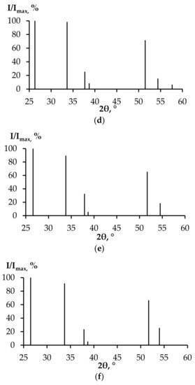 XRD patterns (after thermal treatment at 600 °C) showing the intensity of diffracted X-rays in planes as a function of 2θ for three samples: (a,f) 10SiO2–85SnO2–5In2O3; (b,e) 10SiO2–80SnO2–10In2O3; (c,d) 10SiO2–75SnO2–15In2O3 (the Miller indices (hkl) are also shown beside the peaks).