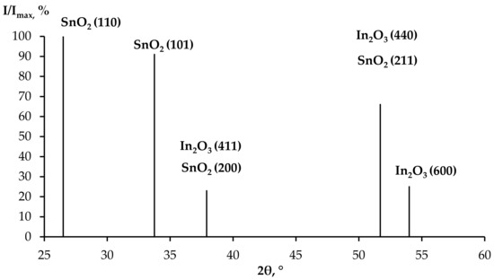 An analysis of the X-ray phase analysis data for the nanocomposite powders (10SiO2–85SnO2–5In2O3, 10SiO2–80SnO2–10In2O3 and 10SiO2–80SnO2–10In2O3 (mas. %) showed that after a thermal treatment at 300 °C (Figure 9), the peaks of the SnCl2 and InCl3 phases occurred, as well as peaks reflecting the initial crystallization of the SnO2 and In2O3 phases. As the concentration of indium salts in the sample grew, the general appearance of the diffractograms stayed the same, but a widening of peaks in the InCl3 phase alongside a decrease in their intensity was noticed, as well as a more pronounced crystallization of the SnO2 phase. It may be assumed that chloride anions were captured by positively charged ions of indium. During this, the released tin ions actively interacted with oxygen atoms, as a result of which SnO2 crystallites were formed. After a treatment at 600 °C, the SnCl2 phase peaks disappeared completely, but the InCl3 phase peaks remained, and well-formed SnO2 phase peaks appeared (SnO2 (110), SnO2 (101), SnO2 (200), SnO2 (211) and SnO2 (002)), while the intensity of the In2O3 phase reflexes decreased (In2O3 (411), In2O3 (440) and In2O3 (600)). At the same time, as the concentration of indium salts grew, the general appearance of the diffractograms remained the same, but the SnO2 phase peaks widened, even in the small angle section, which indicated that the size of the SnO2 crystallites decreased. After a treatment at 700 °C, only the SnO2 and In2O3 phase peaks remained (Figure 11). The size of the crystallites was estimated with the Scherrer equation, and was equal to 17–37 nm.