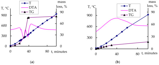 According to the results of the TGA, at 100 °C (Figure 12a), endothermic effects occurred associated with a mass loss of 79% and the simultaneous crystallization of the material. This was confirmed using the XRD data; already at 300 °C, the crystallization of the SnO2 phase could be observed. The thermogravigram at 600 °C (Figure 12b) reflected a mass loss of 17% against the background of an exoeffect, indicating the continued crystallization of SnO2 and In2O3.