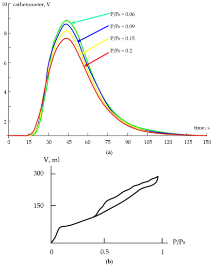 A water solution of ammonia was used to turn the sols into gels (for creating xerogel powders). The produced wet gel was dried out at a temperature of 100 °C for 50 h and later kept at constant temperatures of 300 °C and 700 °C. To study the xerogel powder samples using X-ray diffraction (XRD, DRON 3.0, Burevestnik, Saint-Petersburg, Russia) and thermal gravimetric analysis (TGA, laboratory installation, St. Petersburg, Russia), the BET (Brunauer–Emmett–Teller) technique was used to determine the surface areas of the xerogel powder samples. The characteristics of the xerogel powders were studied using a gas-adsorbent Sorbi-series analyser (Meta, CJSC, Novosibirsk) by comparing the volumes of the adsorbent gas (nitrogen) adsorbed by the sample, with samples (specific surface area of 106 m2/g) provided by Meta, CJSC. As a rule, the plant compatible with the thermodesorption method (TDM) consisted of a gas preparation part (usually tanks filled with N2- or Ar-adsorbent gases and He carrier gas), an adsorber, a U-shaped tube, and a gas meter. Adsorbent training happened inside the adsorber, which was placed inside a furnace at a temperature range of 200–350 °C and with He or an Ar/He mixture flowing through. After that, the adsorber was cooled to room temperature with the gas still flowing (at such a temperature, Ar and He normally do not adsorb); then, the adsorber was placed inside a cryogenic storage drawer filled with liquid nitrogen—at this temperature, Ar was adsorbed, but the carrier gas (He) could practically still not be adsorbed). After equilibrium saturation at a fixed concentration of Ar, the adsorber was heated to room temperature, the Ar adsorbed at 77 K was released and its quantity was measured with a thermal conductivity detector–katharometer.