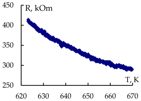 where R is the resistance of the sample, is the typical value for this sample, = 8.615·10−5 eV/K is the Boltzmann constant, T is the temperature and is the activation energy, which confirmed the semiconductor characteristic of the conductivity of the metal oxide structures. Using temperature dependencies (in the range of 300–400 °C, Figure 15), the activation energies of the conductivity of semiconductor nanocomposite materials were calculated (which were found to be (0.24–0.46 eV), as well as the temperature resistance coefficients equal to the relative change of the resistance when the temperature changed by 1 K, and was equal to:
