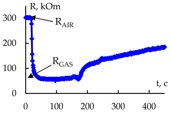 Figure 16 shows the typical change in the resistance of the sample under the impulse of reagent gas and the further change in the resistance during reduction. The research carried out to determine the sensitivity to acetone and ethanol fumes showed that the reduction time after the impulse was 2–40 min, depending on the detection temperature and sample structure. It was established that a temporary resistance reduction in semiconductor nanocomposites after the impulse of a reagent gas could be performed by sending a thermal (600 °C) impulse for 30 s; in this case, the sensitivity to reagent gases under the same detection conditions could increase 1.5–4 times due to the OH desorption from the surface and higher RAIR.