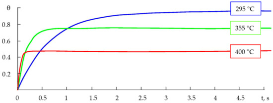 Typical dependencies of degree of filling on time (at different temperatures within BET model).