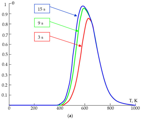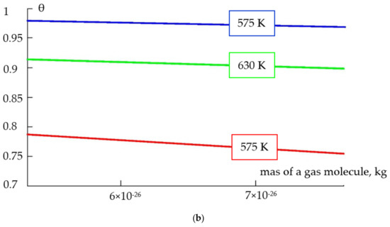 Comparing the experimental gas sensitivity data to the results of computer modelling showed the existence of an optimal temperature range for the detection process, outside which the degree of the surface filling in a particular adsorber–adsorbent system decreased, and which was found to be between 300 and 400 °C (573–673 K) (Figure 19a). At temperatures close to room temperature, the adsorption process would proceed quite slowly; for example, at room temperature (293 K), the adsorption of ethanol vapours could take up to 3 h, in which case, the filling degree would be θ = 0.2 (within the Langmuir and BET models). It was shown that the filling degree depended on the mass of the molecule—the heavier the molecule, the lower the degree (Figure 19b).