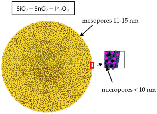 The analysis of gas sensitivity measurements based on PPD and X-ray phase analysis data allowed us to find the optimal temperature for annealing nanocomposites of a three-component system, SiO2–SnO2–In2O3 (700 °C). Based on complex studies of AFM, the BET technique and on previous research [47,48], a hierarchical model of the formation of two-component and three-component porous nanocomposites was proposed, presented in Figure 20 and Figure 21 (in the inset, the semiconductor and dielectric grains of nanocomposites are indicated in pink and blue), accordingly. According to the AFM data, it was found that two-component porous nanocomposites, SiO2–SnO2, were macro–meso–microporous (macropore sizes of 170–180 nm and mesopore sizes of 40–50 nm) and three-component porous nanocomposites, SiO2–SnO2–In2O3, were meso–microporous (mesopore sizes of 11–15 nm). According to the gas sensitivity measurements, it was established that the deliberate introduction of a semiconductor additive of indium oxide into a two-component system, SiO2–SnO2, increased the sensitivity of the nanostructured layers to reductional reagent gases by tenfold.