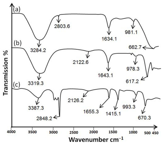 Sulfur nanoparticles were investigated for the identification of functional groups using ATR-FTIR. The ATR-FTIR spectra of Citrus limon leaf extract showed a significant intensity peak at 3284.2 cm−1 with a wide transmittance band (3700–2800 cm−1). Figure 4a shows that there is a link between carboxylic acids and alcohols that are intermolecularly bound and their O–H starching vibrations. The weak bond is attributed to alkynes’ C≡C stretching vibrations at 2803.6 cm−1. The medium bond is attributed to the C=C stretching bond between alkenes at 1634.1 cm−1. The strong bonds between 981.1 cm−1 and 662.7 cm−1 are attributed to aromatic compounds bending vibration with benzene rings and C-H group stretching with halogen groups. In addition, Kumar et al. (2019) demonstrated that the functional groups of Citrus limon leaf extract showed the same major peak [25].