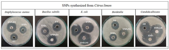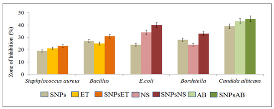 The overall findings of the study showed that the combination of antibiotics with SNPs synergistically enhanced their antimicrobial and antifungal activities against Gram-positive (Staph. aureus and Bacillus) and Gram-negative (E. coli and Bordetella) and fungal strains (Candida albicans), as shown in Figure 5 and Figure 6.