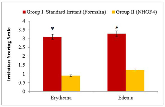 Tests were conducted to determine the effectiveness of an optimized nanohydrogel formulation (NHGF4). A NOC for the project was approved by the Gomal Centre of Pharmaceutical Science, Faculty of Pharmacy, Gomal University, Dera Ismail Khan, KP, Pakistan. In this study, healthy albino male rats weighing 250 g were used. Food was provided as per the standard recommendations [49]. During the experiment, rats were kept at room temperature (25 ± 2 °C), and humidity was maintained at 50 ± 10%. A total of two groups of rats were used (Group I and Group II). As a control, rats in Group I were treated with the standard irritant formalin, whereas in Group II, rats were treated with prepared nanohydrogel formulations (NHGF4). Skin irritation was scored visually based on the appearance of the skin. There were four categories of skin irritation: “0” means there is no skin irritation, “1” means there is a slight irritation, “2” means there is a well-defined irritation, “3” means there is a moderate irritation, and “4” means there is scarring [49].