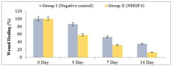 In vivo studies were performed to investigate the effectiveness of NHGF4 in wound healing. Albino male rats were used to study the effect of NHGF4 on incision wound healing. Group I consisted of rats that were negative controls, and Group II consisted of rats that were treated with NHGF4. Figure 9 and Figure 10 showed the % reductions in wound areas for Groups I and II, respectively.